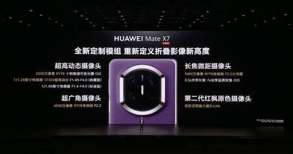 影像方面,Mate X7标准版后置主摄为50MP传感器(1/1.56",F1.4~F4.0,RYYB,OIS),典藏版则搭载更高规格的50MP主摄(1/1.28",F1.49~F4.0,17.5EV)。此外还配备40MP超广角镜头(F2.2,RYYB)和50MP潜望长焦(3.5倍光学变焦,OIS),并加入第二代红枫原色摄像头,宣称色彩还原度提升43%,进光量提升96%。前置双摄均为8MP,F2.2光圈。