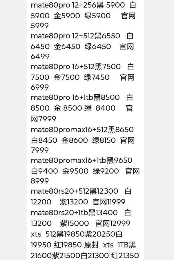 华为Mate 80 Pro Max有16GB+512GB、16GB+1TB两个版本,华强北价格同样高于官网(如16GB+512GB官网7999元,华强北黑色为8650元)。配色差异更显著:绿色价格明显低于其他配色(16GB+512GB绿色8150元,比黑色便宜500元;16GB+1TB绿色9200元,比黑色便宜450元);黑色仍为最高(16GB+512黑8650元,16GB+1TB黑9650元),白色、金色介于两者之间。